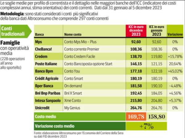 I giovani sono i più colpiti da questi aumenti nei costi dei conti tradizionali, seguiti dalle famiglie. I pensionati, invece, sperimentano incrementi di entità minore, ad eccezione di casi particolari come Poste (+23% dall'inizio dell'anno), Bpm (+48%) e Credem (+16%). Questi dati emergono dall'ultima indagine condotta da Altroconsumo per conto de L'Economia del Corriere della Sera, che ha confrontato gli "Icc" (Indicatori di costo complessivo) dei conti correnti nel periodo di nove mesi compreso tra il 31 gennaio e il 5 dicembre dello scorso anno (vedi tabella qui sotto). È interessante notare che, durante lo stesso periodo, l'inflazione è diminuita al 5,7% nel mese di novembre.